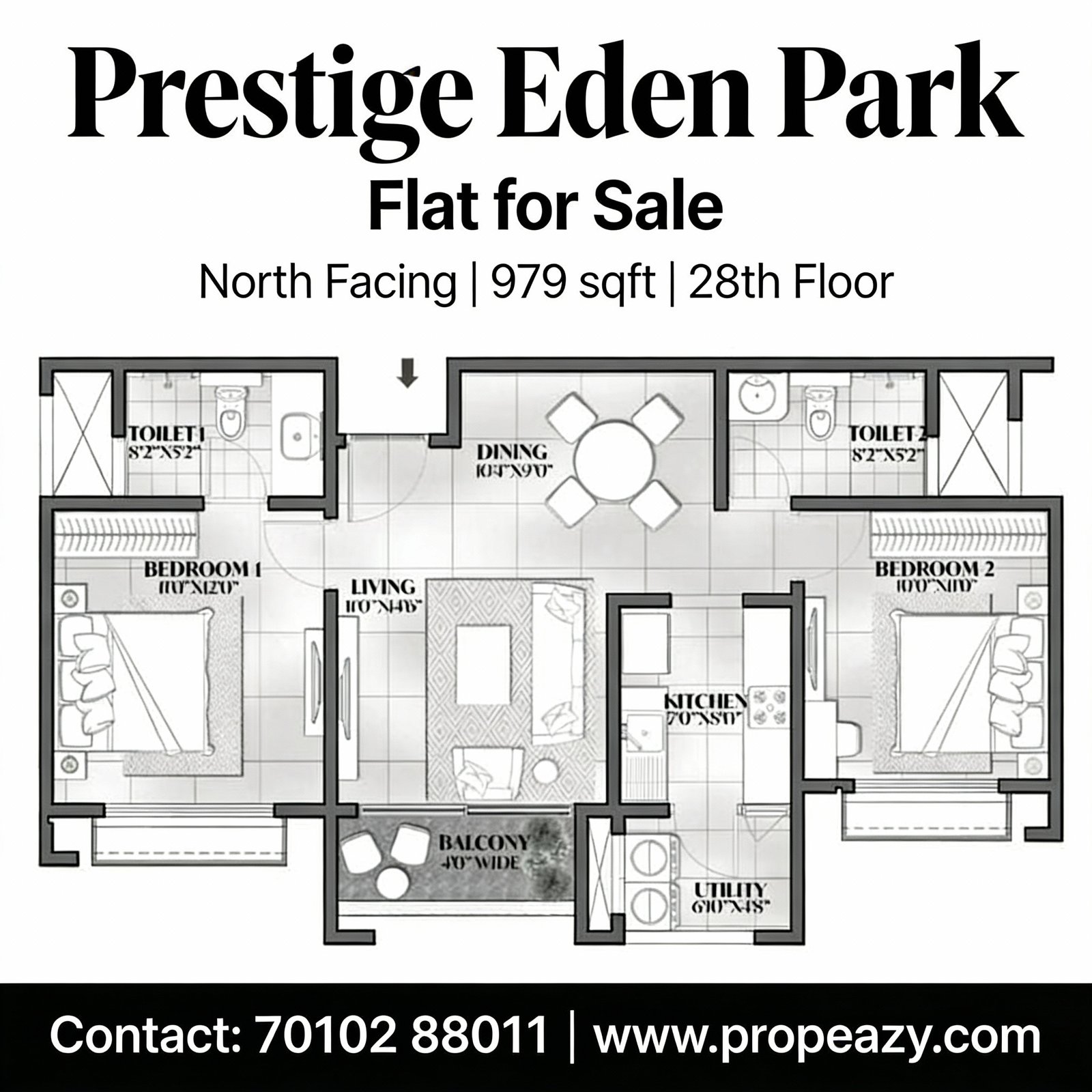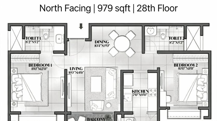 Discover this beautifully designed 2 BHK apartment in Prestige Eden Park, one of the most premium communities within the iconic Prestige City township on Sarjapur Road, Bangalore. With a generous carpet area of 979 sq ft, this north-facing flat on the 28th floor offers unobstructed panoramic views and abundant natural light throughout the day.